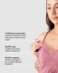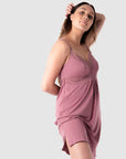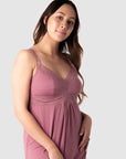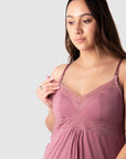 Dream Nightie is designed in a soft comfy fabric with a flattering fit. Dream nightie has light support with a side sling for skin to skin feeding. It has a graphic lace trim detailing on the neckline and the underbust, with a gathered front allowing room for a changing body shape.