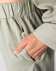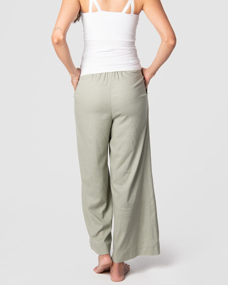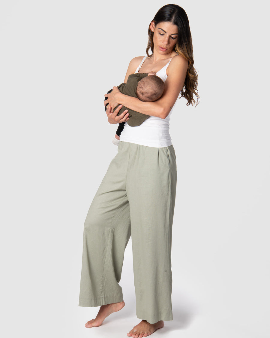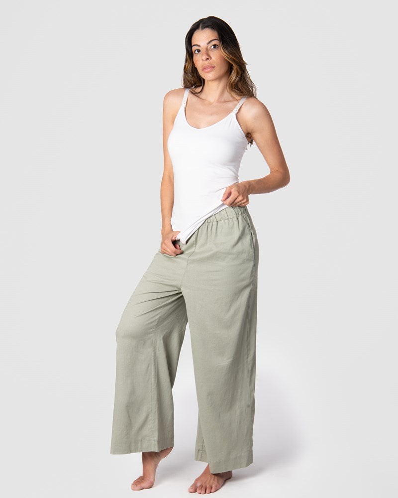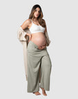 Made from a luxurious linen blend, these pants are a generous fit with a wide stretchy elastic waistband in 3/4 leg length, a great easy-wear natural lounge style. Taking you through pregnancy breastfeeding and beyond.