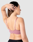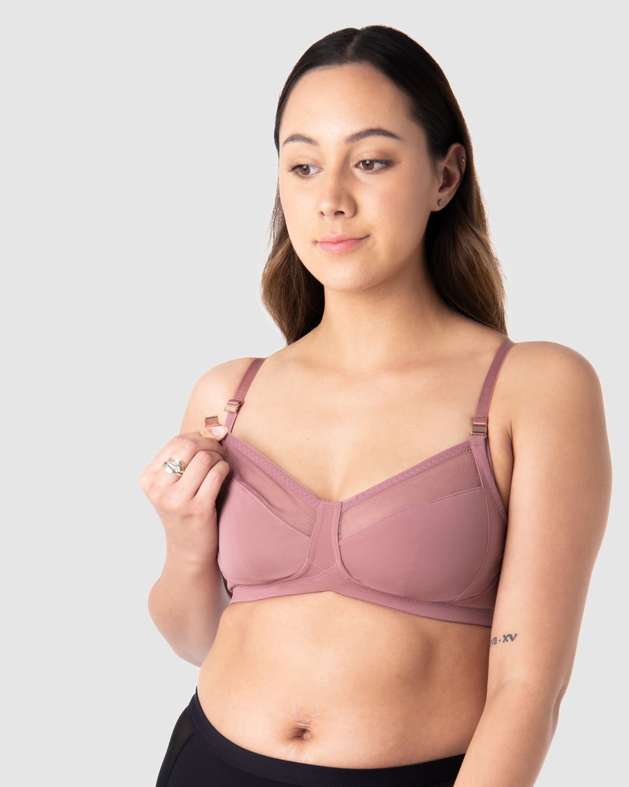 Lunar Eclipse nursing bra showcases graphic lace that gives the illusion of a lower neckline. Inspired by the best-selling Hotmilk "Show Off" design, it features sleek microfiber that effortlessly molds to your body for a flattering silhouette. With a side sling and 4-piece cup support, it offers a natural, rounded lift. Equipped with Hotmilk's signature magnetic nursing clips and side sling feeding support, it ensures convenient nursing while promoting skin-to-skin contact.