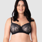 Warrior Demi Balconette is for Mamas that define their own journey through motherhood and stay true to themselves and their style. Plunging demi neckline, strap style sling, and lace back mean all angles are covered. Standard or Racerback design, low cut contour cup with graphic lace outer, discreet magnetic nursing clips and demi balconette style for ultimate lift.